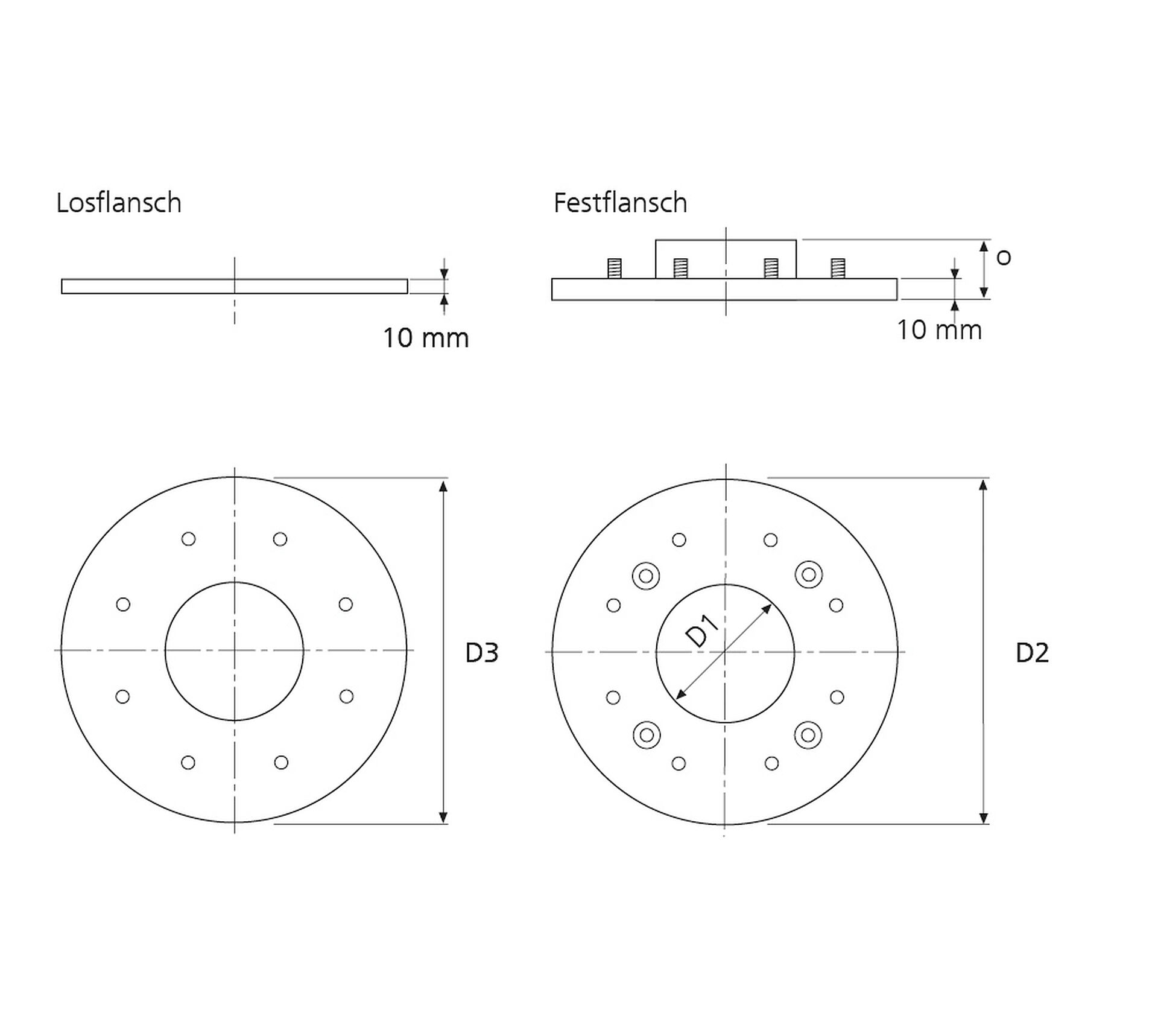 D1: Futterrohr Øi, D2: Festflansch Øa, D3: Losflansch Øa